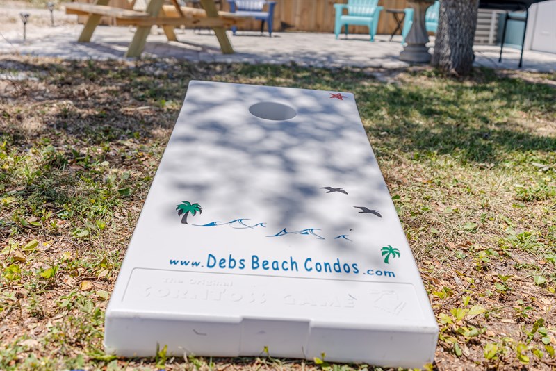 - Large side patio with picnic table, chairs and grill; corn hole, ping pong table.