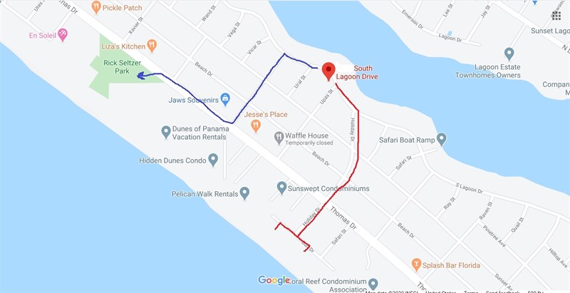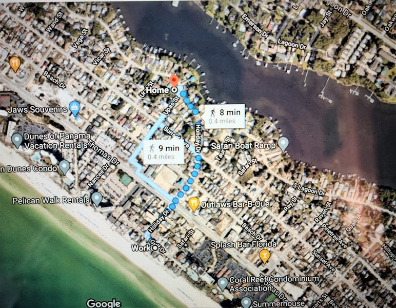 This home is on South Lagoon Drive which runs along the Grand Lagoon... and is located across the street.... you have beautiful water views as you stroll along South Lagoon; and often see water birds, fish and dolphins! We are located <1000 ft from the closest boat launch if you want to bring a boat or jet skis; kayaks or paddle boards! We are a short 8-10 minute walk to three public beach access entrances. I HIGHLY recommend Rick Seltzer Public Beach Park with parking, bathrooms and lifeguards - a short 1/2 mile drive.